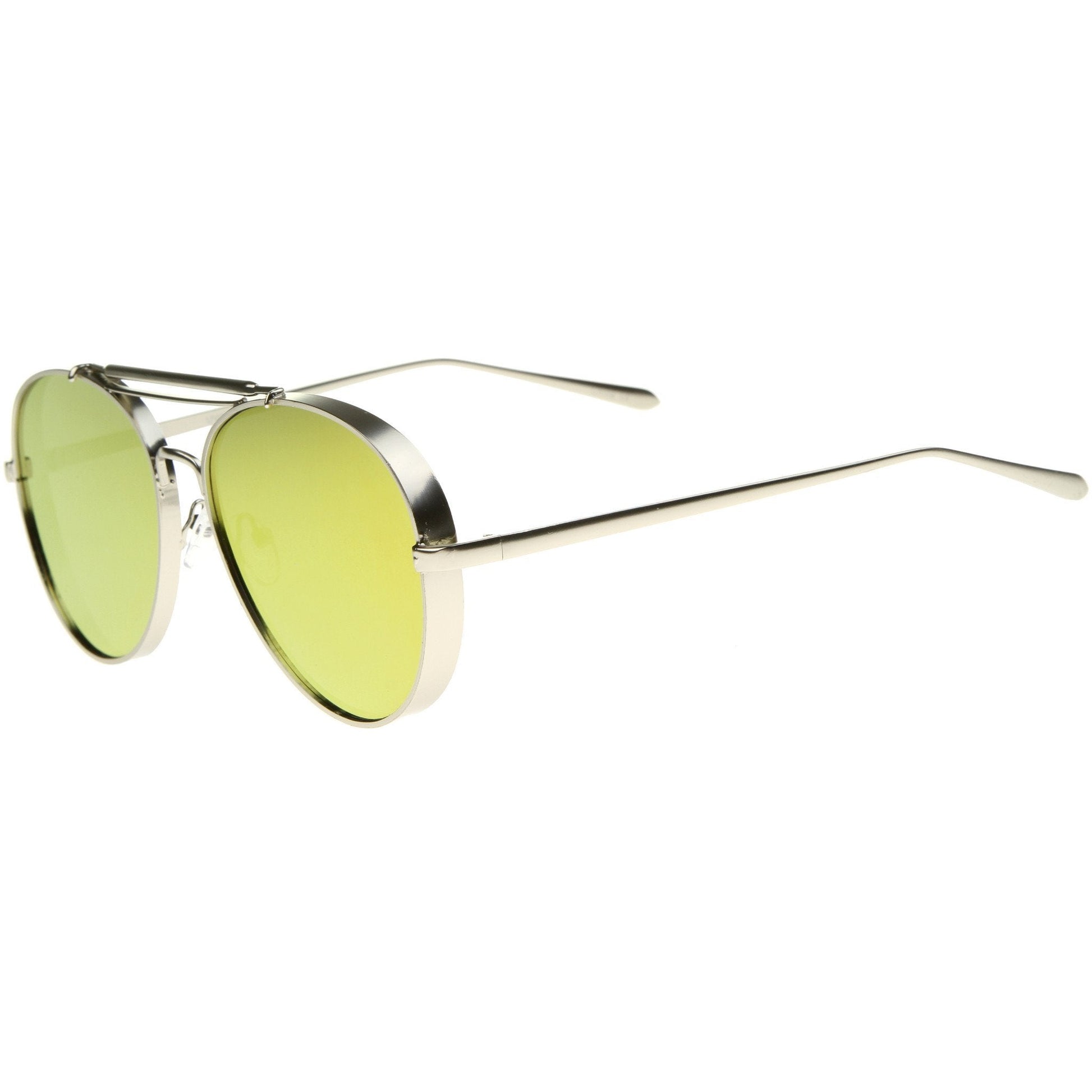 Iconic tear drop aviator silhouette is revamped with a bold thick rimmed frame. Stylish flat lenses with vibrant mirrored colors bring all the elements together for a robust fashion statement that will add some edge to any outfit. A sleek crossbar and full metal arms and nose bridge complete this classy and cool, polished look. Made from a metal frame, reinforced hinges and UV400 protected polycarbonate lenses.