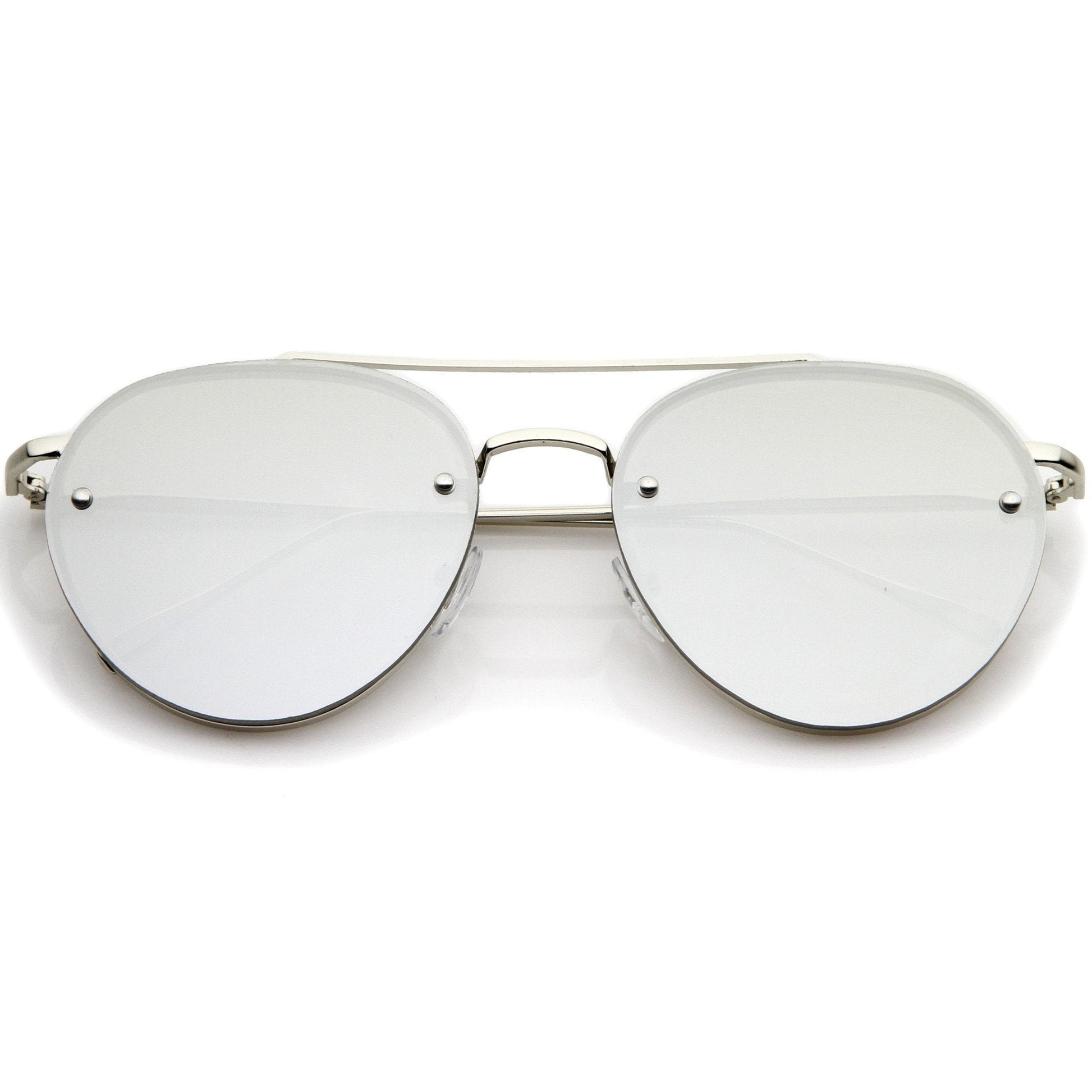 With a minimal design, but a bold effect, these exquisitely crafted sunglasses feature a rimless aviator frame with ultra-slim metal temples and brow bar. Reflective colored mirror flat lenses and rivets at the front give these sunglasses it's stunning finish. Versatile enough to wear from season to season, these rimless aviator sunglasses can be easily paired with any look. Made with a metal based frame, English style nose pieces, metal hinges, and reflective UV400 protected lenses.