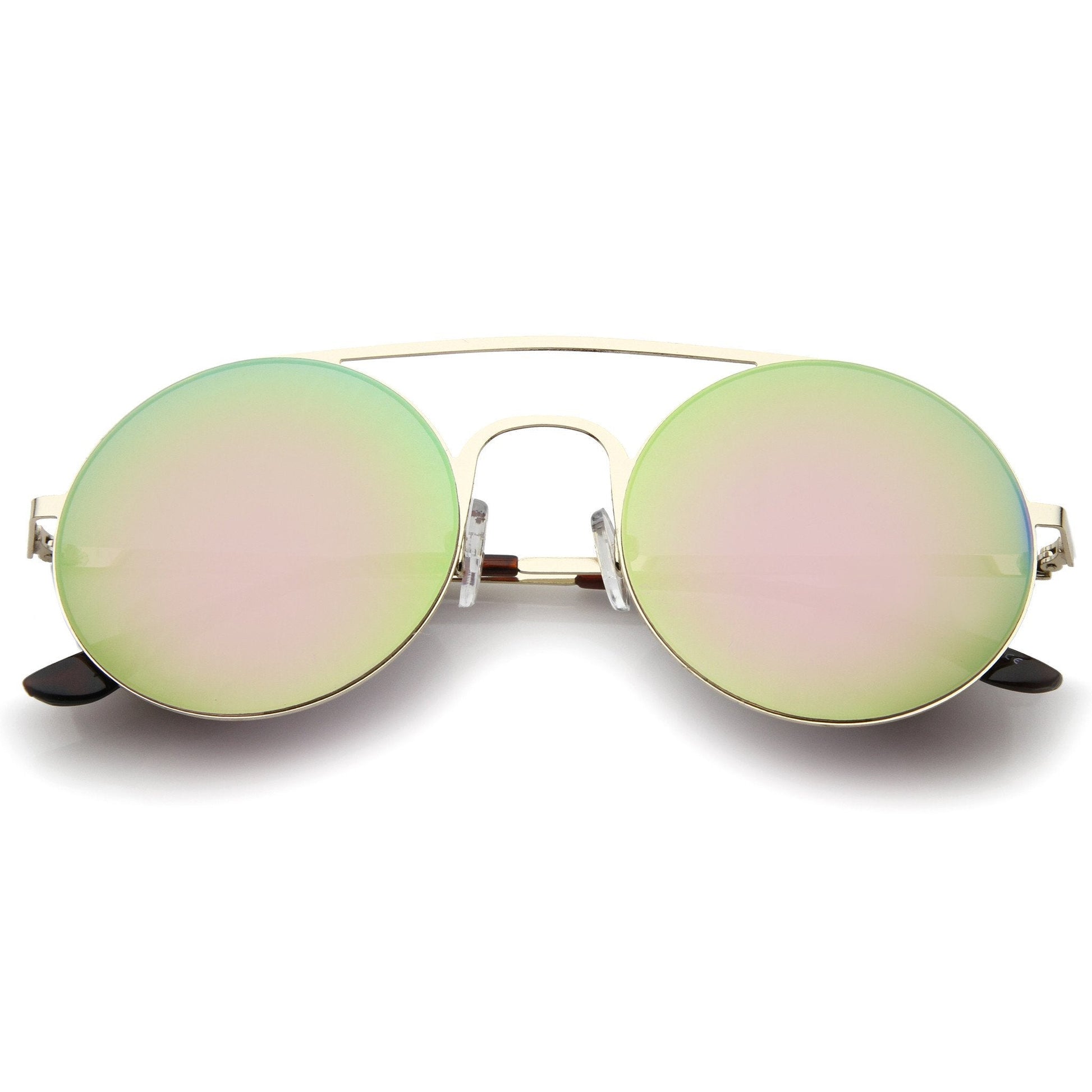 Ultra luxurious and sophisticated, these round sunglasses are exquisitely crafted with a slim metal frame for a lightweight feel. Stunning colored mirror lenses and a sleek double nose bridge complete this elegant and chic style. Versatile to wear every day, these minimal round sunglasses are a must-have this season. Made with a metal based frame, English style nose pieces, metal hinges, and reflective UV400 protective lenses.